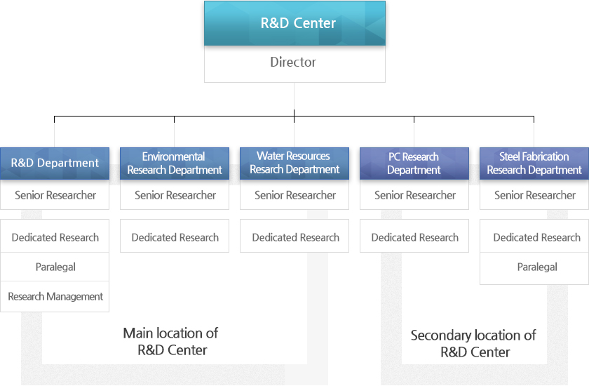 The R&D Center, which obtained authorization from the Ministry of Science and Technology in 1994, is comprised of the R&D Department, Environmental Research Department, PC Research Department, and Steel Fabrication Department. It is responsible for developing new technologies and construction methods in response to an age where there is limitless competition for new technologies. In a period where environmental problems have become important issues, our center holds a track-record of environmental research which includes development of nitrogen phosphorous high-class treatment techniques, combustion efficiency increasing devices in mid/large-sized incineration facilities, chemical deodorizers capable of treating various chemicals, etc. We will continue to lead the way in developing and commercializing state-of-the-art construction techniques through our decisive R&D investments.