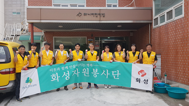 화성산업(대표이사 사장 이종원), 화성자원봉사단은 지난 27일 수성구 두산동 소재 장애인 전문시설인 화니어린이집을 방문하여 환경미화 및 물품후원을 통한 자원봉사활동을실시했다. 화성자원봉사단은 매월 1회 봉사활동을 통해 어렵고소외된 이웃에 나눔을 실천하고 있다. 사랑의 집수리 봉사활동은 물론이고, 장애인시설 방문물품전달 및 환경미화, 일손돕기 등의 다양한 활동을전개해 나가고 있다.
